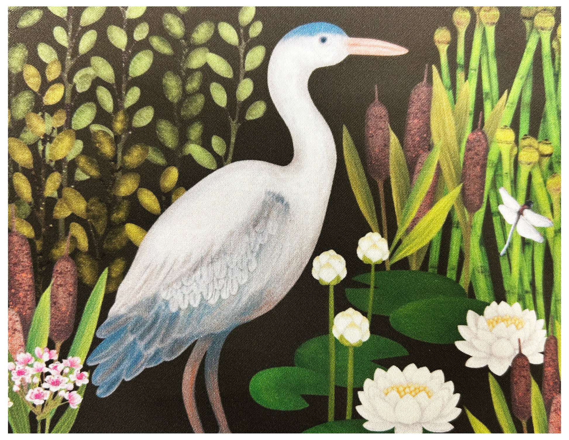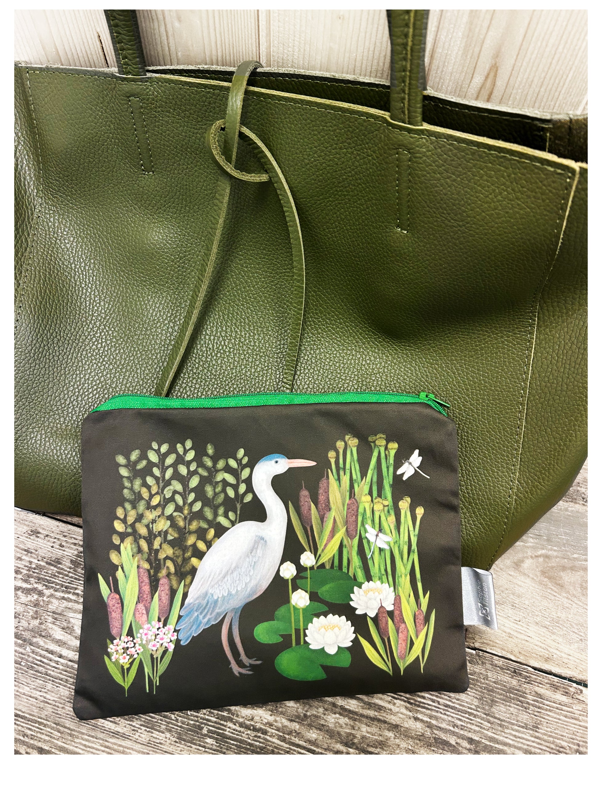 Inspired by tranquil riverside scenes, this handmade pouch features a majestic heron, pretty waterlilies and delicate dragonflies.