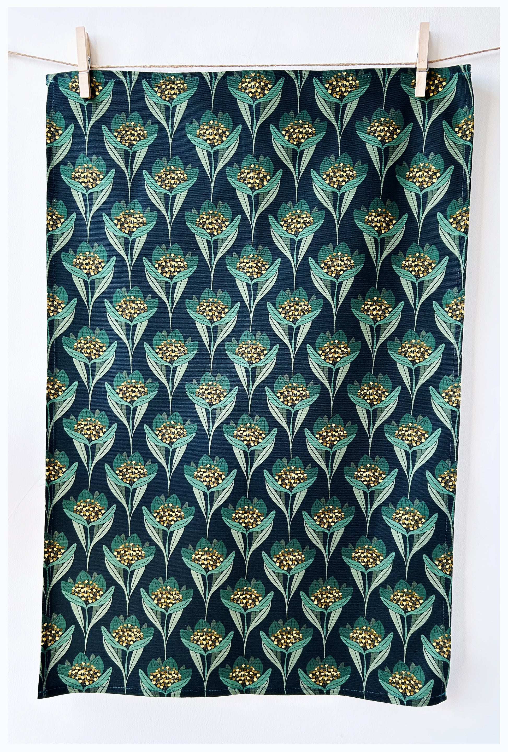 Featuring an elegant flower pattern in muted teal and golden yellow on a dark blue/black background, this cotton tea towel is both functional and stylish.